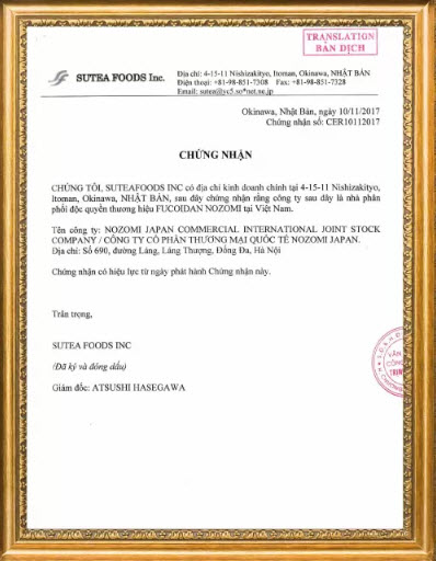 Nhà sản xuất viên nang fucoidan nozomi Nhật Bản chứng nhận phân phối độc quyền tại Việt Nam